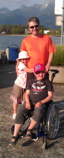 Mattias har varit på skolresa. Målet var en sjö vid Luzern. På förmiddagen ringde hans assistent och sa att hans trehjulingsvagn gått sönder, bromsen blockerar hjulet och det går inte att rulla den längre. Jag var i stan men körde hem med en gång och hämtade rullstolen. Under tiden hade Mattias bestämt sig för att promenera vidare med klassen. Han ville absolut inte missa båten som skulle föra barnen över sjön (5 minuter på en liten, liten motorbåt men en stor upplevelse för barnen!). Han klarade av att gå! Motivation är viktigt när man vill nå ett mål!
