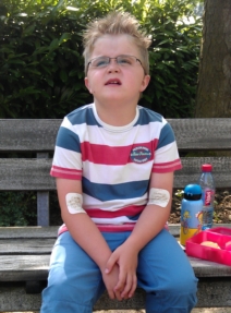 Under rasten sitter han oftast med en kompis på en bänk och tittar på de lekande barnen. Lunchrasten hemma behöver han för att vila sig. Han leker oftast efter maten, halvt sittandes eller liggandes på en matta i sitt rum. Två gånger i veckan har han skola på eftermiddagen också. Gymnastiksväskan orkar han aldrig bära själv.